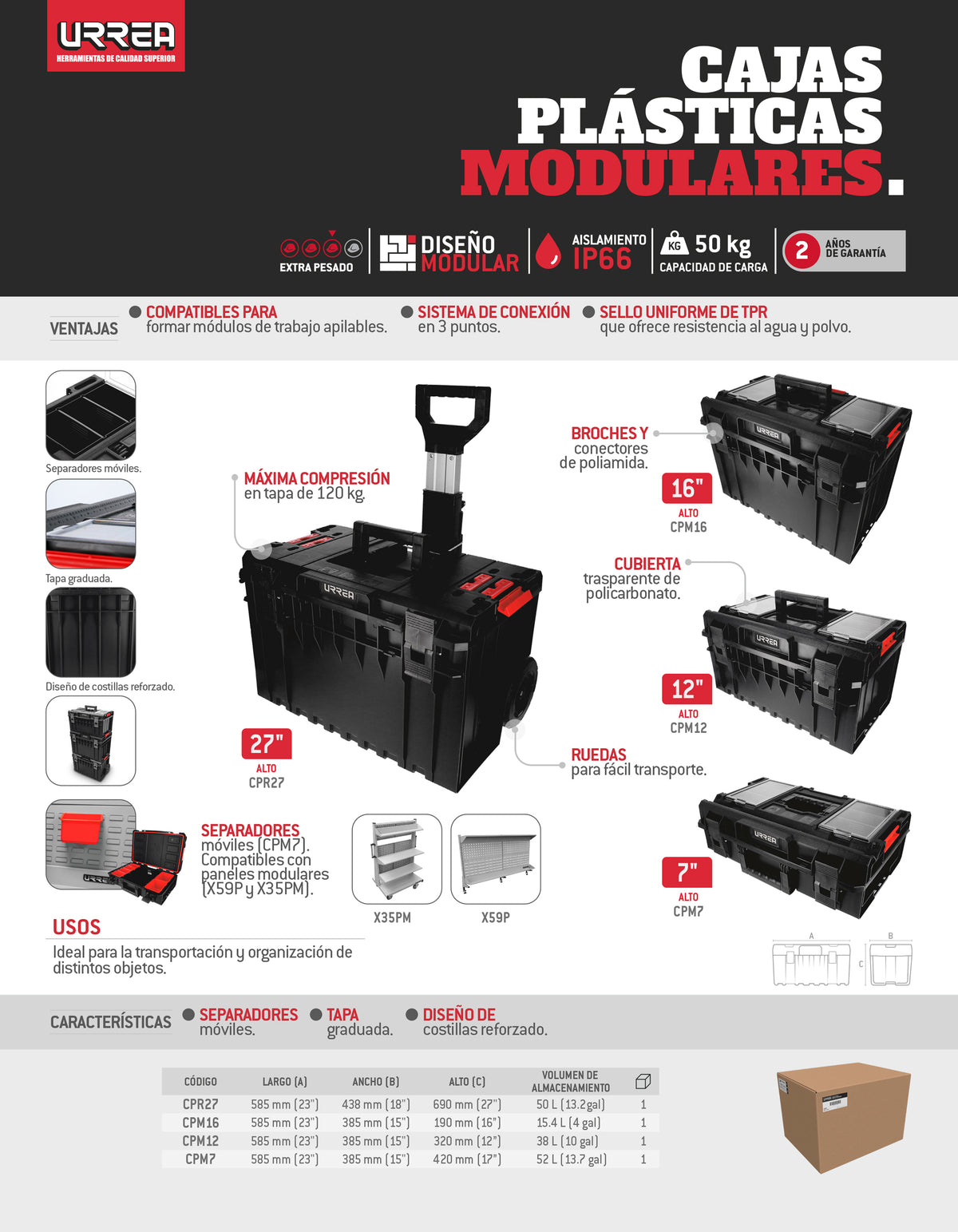 -Protección IP66. Diseño de costillas reforzado. Compatible con el Sistema Modular de Almacenamiento Urrea. Broches y conectores de poliamida que ofrecen una mayor resistencia. Uso extra pesado. No sobre pase la especificación de carga máxima.