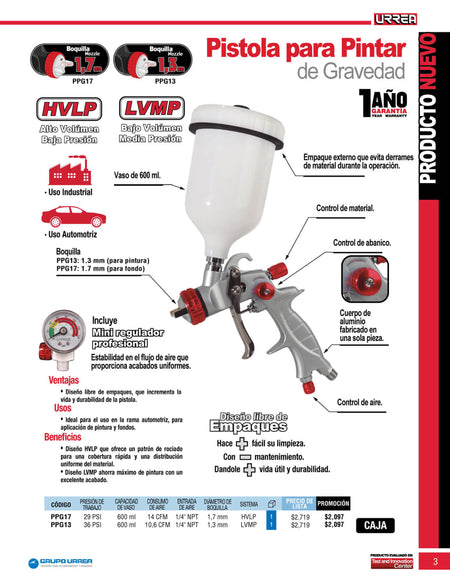 Pistola para pintar con alimentación de gravedad, capacidad 600 ml, 29 PSI Urrea